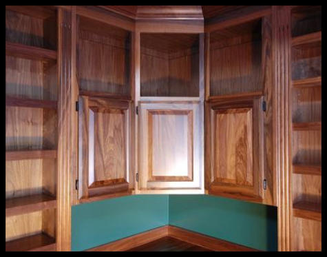 angled storage cabinet featuring hand-fitted walnut raised panel